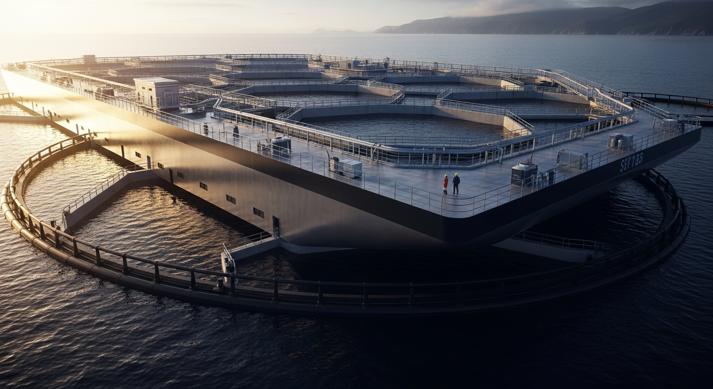 Havfarm is a massive offshore salmon farming installation developed by Nordlaks in Norway. It stretches 385 meters and is permanently anchored in deep sea waters to support sustainable and large-scale fish farming.