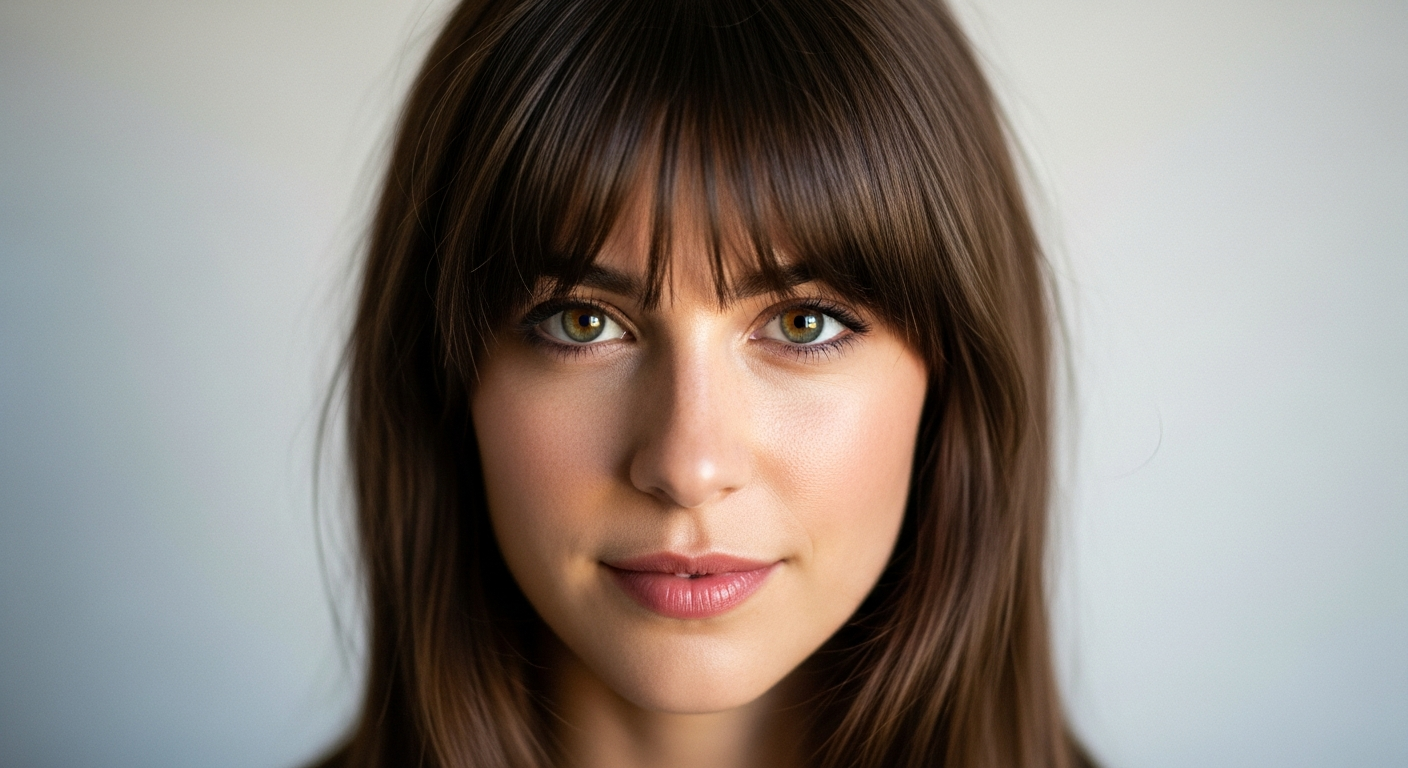 - Mid-length bangs that taper softly at the sides